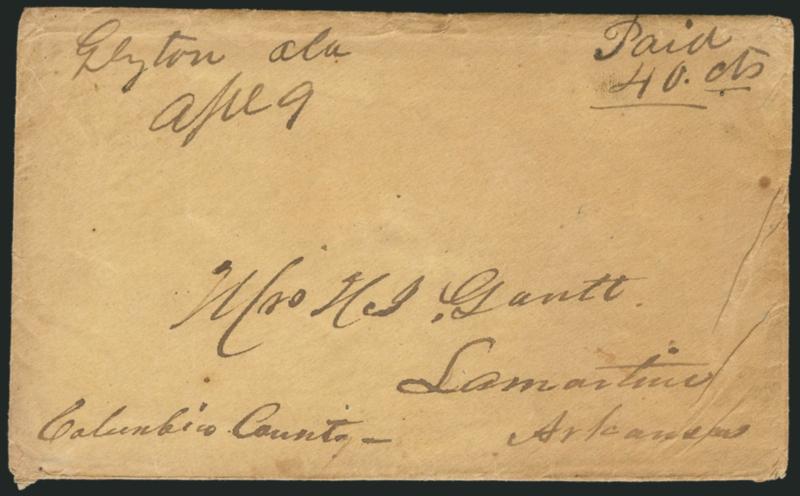 Elias W. Black was a soldier in the 4th Arkansas Regiment who was discharged for disability in June 1862. He operated an express between Arkansas and McNair's Arkansas Brigade of the Army of Tennessee. He charged $1.00 on letters to Arkansas, but return letters were apparently free. He carried his westbound letters to Washington, Arkansas, where he sent them onward in the Confederate mails. Return letters to the Brigade were sent under cover to his attention at Hampton, Arkansas (see Stefan T. Jaronski, "Another Private Trans-Mississippi Express Service Uncovered", Confederate Philatelist, No. 241). Certain covers from the Spence correspondence previously thought to have been carried by E. W. Black are now attributed to Barksdale's Express (see Sale 988, lot 282). (Image)