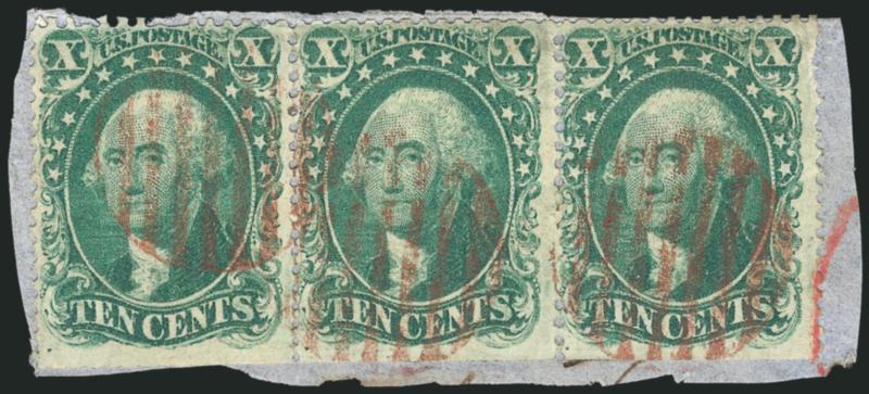 427   Image10c Green, Ty. I (31). Horizontal strip of three, tied on small piece by brown red grids, perfs trimmed, end stamps small margin faults, about Fine centering, rare multiple (Image)