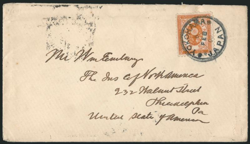 their new possession recently purchased from Spain", the letter was posted in Japan and is franked with Japan No. 79 tied by bold "Yokohama Japan 6 Feb 00" circular datestamp, couple trivial perf flaws, still Very Fine, scarce and unusual,