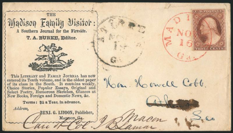 1769 c Image1c-3c 1851 Issue, Georgia Corner Card Covers (7, 11). Three covers, one with No. 7 strip of three (faults), other two with No. 11, first two on "University of Georgia, Athens" corner cards, Fine-Very Fine, third on "Madison Family Visitor" journal corner card to Governor Howell Cobb in Athens and forwarded to Macon Ga., "FREE" straightline handstamp struck over Macon circular datestamp, backflap tear, Very Fine, an attractive and scarce use, ex Alexander (Image)