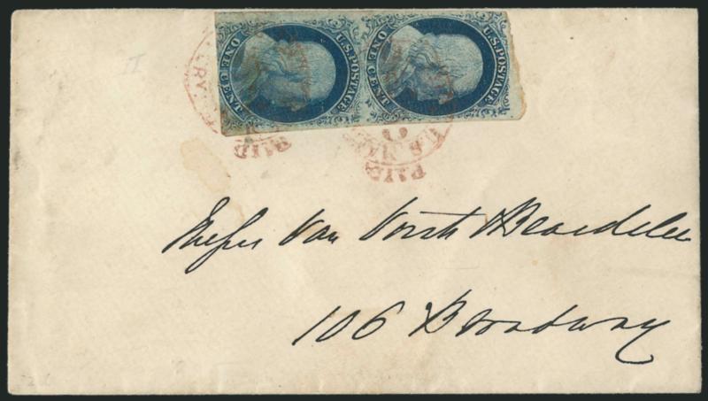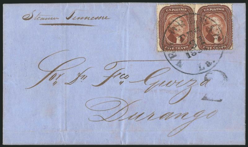 1771 c Image1851-57 Issues Cover Balance (10A/36B). Approximately 28 covers, all attractive uses or better stamps, incl. No. 10A on forwarded cover, group of eight of No. 11A showing Plate 2 Late varieties incl. double and triple transfers, another on illustrated hotel cover, No. 15, Nos. 22-23, 24 var (Ty. Va), No. 24 with scarce Crittenden Ky. rimless datestamp (basis for tracing in Simpson), three with No. 25 incl. one on a beautifully illustrated "Mountain House" advertising cover, No. 26 with dramatic pre-print paper fold, another tied with 1c Eagle Carrier (LO2), No. 28 pair on cover to Durango, Nos. 32-33, 35, pair of No. 36B to England, few faults here and there but overall Fine-Very Fine, acquired by the owner as individual lots in past sales (Image)