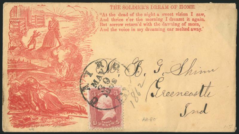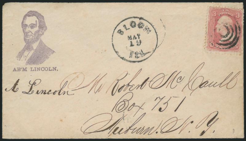 1774 c ImageCampaign Covers. Five covers, first four campaign related and franked with 3c 1861-67 Issues (65 or 94), plus one Patriotic, incl. Lincoln three-quarter portrait facing left and "Ab'm Lincoln" caption (Milgram AL-138), two with Seymour and Blair portraits in ornate frame (Milgram HS-4 and HS-6), second with stamp that shows traces of illegally removed cancel at top left, one with Stephen A. Douglas woodcut three-quarter and facsimile signature (Milgram SD-25), late use as Douglas died in June of 1861, last is Seated Liberty & Flag Magnus design with "The Star Spangled Banner" verses on back, used free to Georgia Plain Vt., extremely rare early Magnus design, a couple small flaws to be found but overall a Very Fine and desirable group, the first three ex Jarrett (Image)
