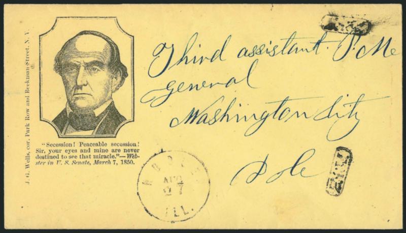 1776 c ImagePatriotic Covers. Two covers, first stampless, Ill. town cancel to Washington D.C., with Daniel Webster illustrated design and "Secession! Peaceable secession! Sir, your eyes and mine are never destined to see that miracle.", "Free" handstamps, top flap tear, Very Fine, ex Kaplan, second 10c Dark Green (273) on "Admiral Sampson" multi-color Spanish-American War design cover with Indian and flag, from Ellis Minn. to Philadelphia, couple small cover tears, otherwise Very Fine (Image)