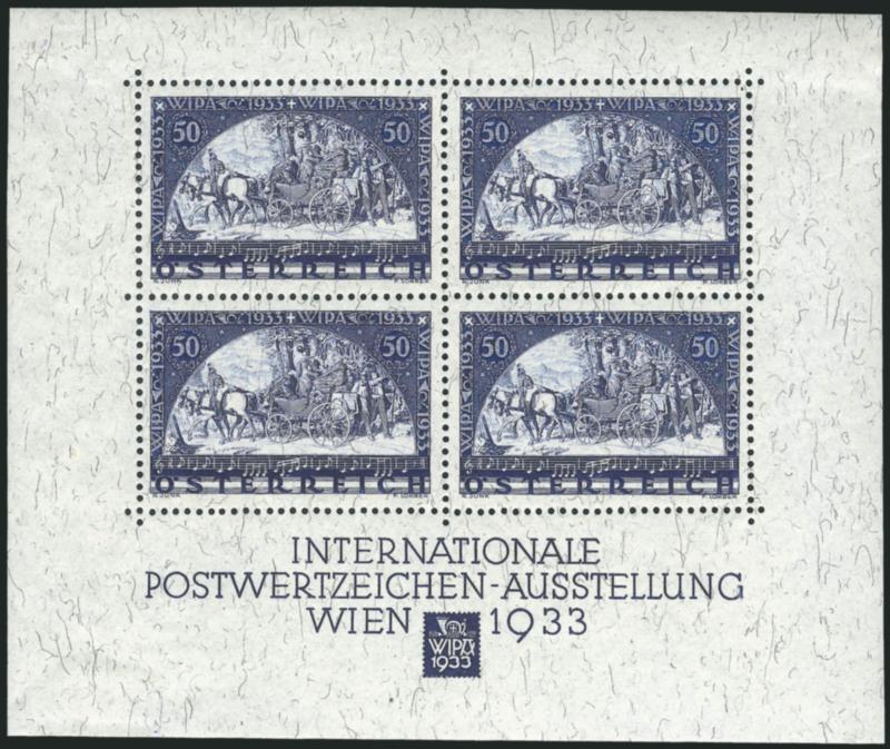 1800 og ImageAUSTRIA, 1933, 50g WIPA Souvenir Sheet, Granite Paper (B111, Michel Block 1). Stamps Mint N.H., rich color, fresh and Very Fine, with original folder which has some adhesive marks on back only (Image)