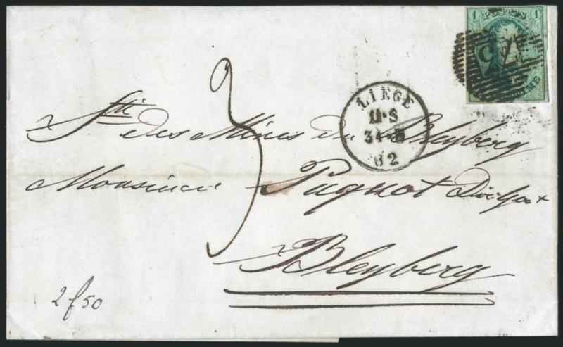1801 c ImageBELGIUM, 1861, 1c Green (9). Large margins to full, tied by "73" in 17-bar grid, "Herbesthal 1-4 1862" backstamp, also with 1862 Liege circular datestamp, on folded cover to Bleyberg, ms. "3" due marking and "2f50" at lower left, stamp with light corner crease at top right, horizontal file fold well away from stamp, Very Fine, scarce use of the single 1c stamp which was intended for prepayment of newspapers and printed matter (Image)