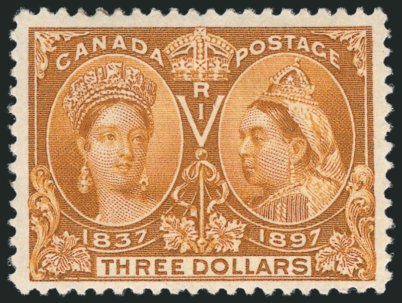 1805 og ImageCANADA, 1897, $3.00 Jubilee (63, SG 138). Original gum, h.r., wonderful deep rich color, Very Fine, with 1983 P.F. certificate, also incl. two -1/2c and one 1c Jubilees, original gum, Very Fine-Extremely Fine, SG £1,120 (Image)