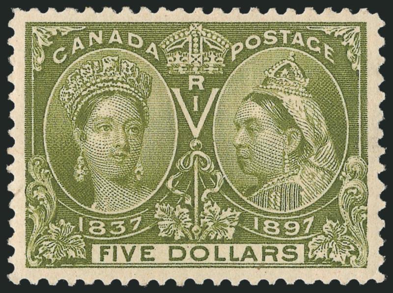 1806 og ImageCANADA, 1897, $5.00 Jubilee (65, SG 140). Original gum, central h.r., wide margins and almost perfectly centered, strong color, tiny margin and perf tip creases, appears Extremely Fine, SG £950 (Image)