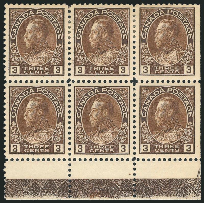 1807 ogbl ImageCANADA. 3c Brown, Ty. D Lathework, Dry Printing, 2c Carmine, War Tax (Unitrade 108, MR2). Two items, first is horizontal block of six of No. 108 with bottom lathework, part arrow and natural s.e. at right, bottom stamps Mint N.H., top stamps long h.r., Extremely Fine, second item is horizontal top imprint block of eight of No. MR2 with part arrow and natural s.e. at left, seven stamps Mint N.H., long natural gum skip, beautifully centered and Extremely Fine, Unitrade value (Image)