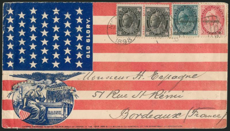 1808 c ImageCANADA, 1898, United States Flag Patriotic Covers (66, 75, 78). Two covers, first 1898 cover franked with pair No. 66 and singles No. 75 and 78 paying UPU rate to Bordeaux, France, Montreal flag cancel, inconsequential small tear at left edge, second an 1899 post card franked with No. 75 to Lancaster Mass., both with red, white and blue United States flag and "Maine" memorial design, "Canada Memorabilis" inscription, Very Fine, attractive pair of Canadian covers showing solidarity with its neighbor in the Spanish-American War (Image)
