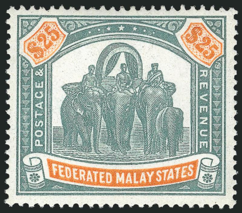 1831° og ImageMALAYA, FEDERATED MALAY STATES, 1928, $25 Green & Orange (76, SG 82). Very lightly hinged, brilliant colors, fresh and Very Fine, SG £1,100 (Image)