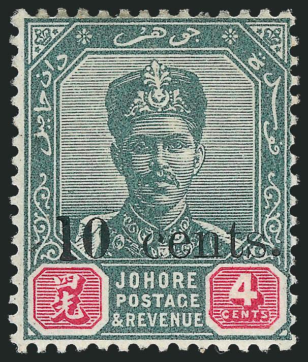 1832° og ImageMALAYA, JOHORE, 1903, 10c on 4c Green & Carmine, Original Values Uncancelled, Tall "1" in "10" (53a var, SG 55Ba). Small h.r., rich colors, short perf at top, otherwise Very Fine example of this scarce variety, the lines cancelling the old value were applied by hand, the large "1" in "10" comes from Position 12 in the 9th row, ex Laycock, with undated B.P.A. certificate signed by (among others) Robson Lowe, the double variety unlisted in Scott, SG value (Image)
