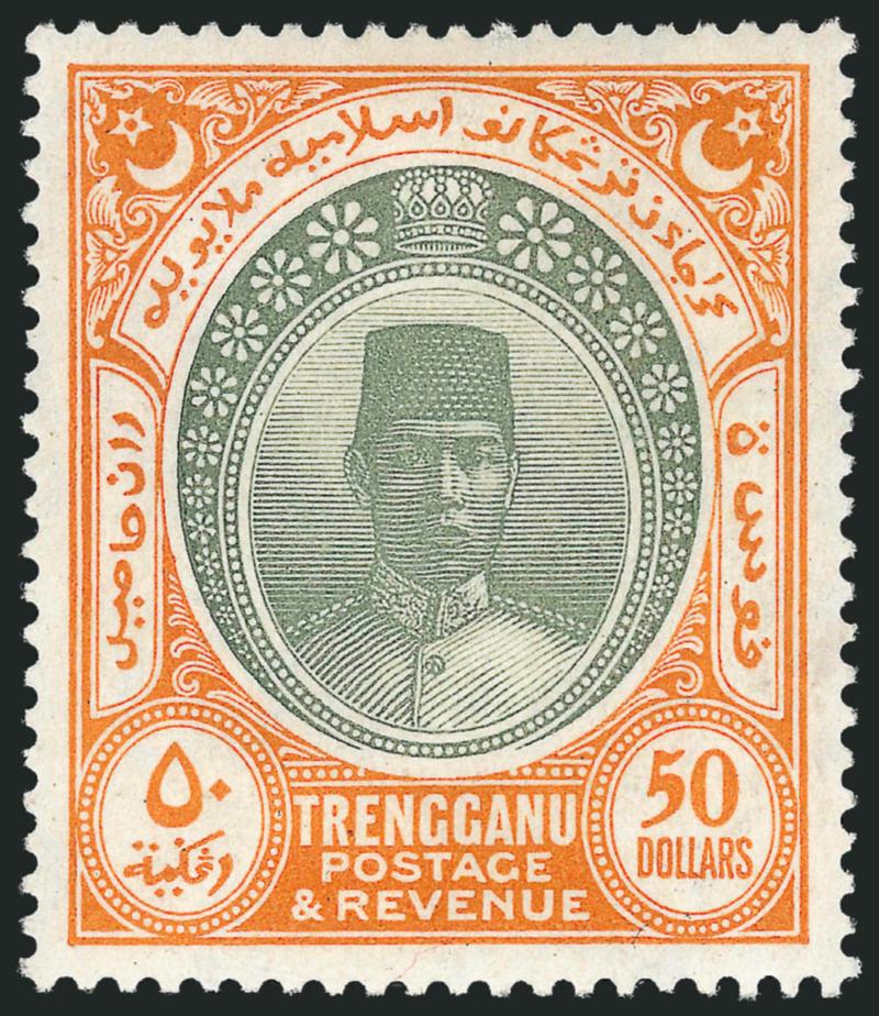 1834° og ImageMALAYA, TRENGGANU, 1921-38, $50.00 Orange and Green (40, SG 46). Very attractively centered with bright colors, lightly hinged, Very Fine and choice, with 2000 B.P.A. certificate, SG £1,900 (Image)