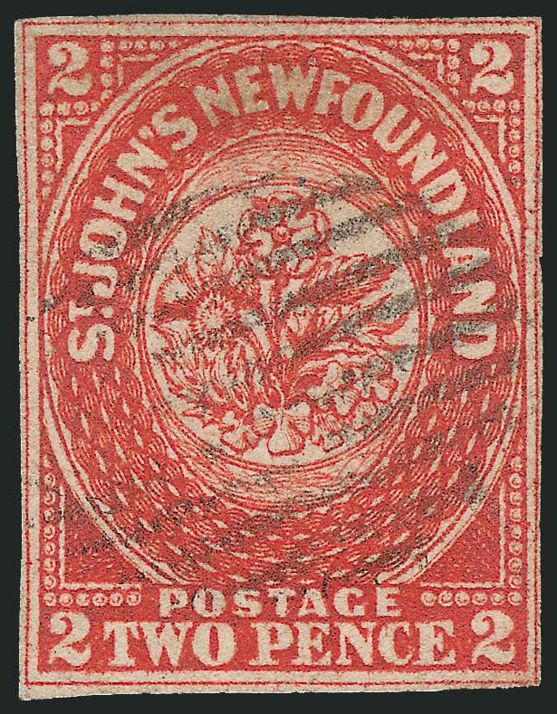 1835   ImageNEWFOUNDLAND, 1857, 2p Scarlet Vermilion (2, SG 2). Clear margins all around, strong color, neat grid cancel, minor thin spot and small repair at top, Fine appearance, signed Raymond H. Weill and with 2010 Brandon certificate, SG £5,500 (Image)