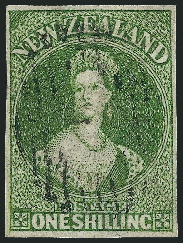 1836   ImageNEW ZEALAND, 1855, 1sh Yellow Green (3, SG 3). Ample and even margins all around, rich color, neat strike of grid cancel leaves entire design clearly visible, small thin spot and small repair at bottom, Very Fine appearance, with 2010 B.P.A. certificate, older R.P.S. certificate no longer accompanies, SG £5,500 (Image)
