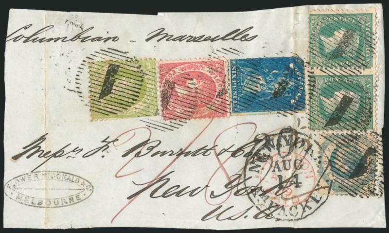 1838   ImageVICTORIA, 1857-58, 6p Blue, Rouletted (30, SG 73). Used with horizontal pair of 2sh Green (26, SG 82), 1sh Blue (25, SG 81), 1p Green (49, SG 74) and 4p Rose (48, SG 80), tied by "1" in grid cancels on cover front only to New York, red "London AU ?, 1859" transit circular datestamp, "New York Am. Packet Aug. 14" circular datestamp, endorsed "Columbian-Marseilles" at top, vertical file fold affects 6p, some other slight wear, otherwise Fine, colorful and scarce franking (Image)