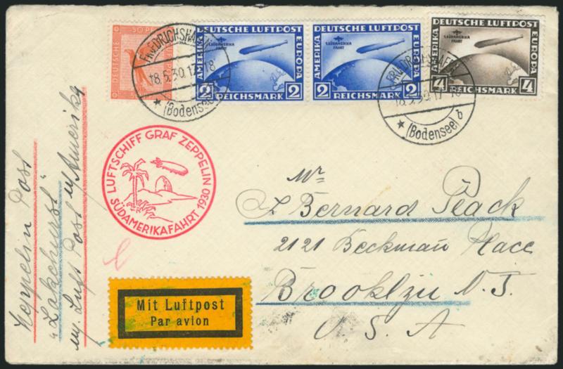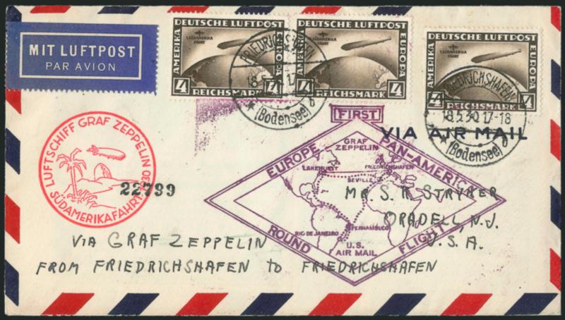 1840 c ImageGERMANY, 1930, 4m Black Brown, South America Flight (C39). Three covers, two with singles tied by "Friedrichschafen 18.5.30" circular datestamps and addressed to Oradell N.J., one endorsed "Via Graf Zeppelin Friedrichschafen to Pernambuco" with Pernambuco backstamp, other with similar instructions but from Friedrichschafen to Rio de Janeiro and with Rio backstamp, third cover bears three singles to same recipient and with instructions "From Friedrichschafen to Friedrichschafen" and with receiving backstamp on June 6 as well as New York Zeppelin receiving backstamp of June 18, first two with red cachets, last with red and purple cachets, each with registry no., fresh and Very Fine set of flown covers (Image)