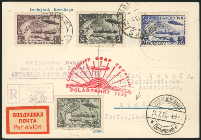 1841 c Image1931, July 24-31 -- Polar Flight, Return Flight, Postmarked on Icebreaker "Malyguin" (AAMC Z-166e). Registered picture postcard with complete set of Russia Imperforate North Pole issue (C26-C29) tied by "Brise-Glace Malyguin 18.VII 31" datestamps to Moscow, Russia, purple Malyguin registry handstamp, Freidrichschafen (July 31) and Moscow datestamps, red cachet, additional purple three-line cachet, Very Fine, beautiful use, small Zierer backstamp, ex Gruys (Image)