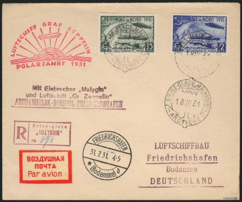 1842 c Image1931, July 24-31 -- Polar Flight (AAMC Z-166). Cover and post card, together they bear the complete set of imperforate Russian North Pole stamps, tied by "Brise-Glace, Malyguin Artique, 18.VII.31" datestamps and addressed to Friedrichschafen, usual cachets, each with receiving circular datestamp, Very Fine, small Wassmann handstamps (Image)