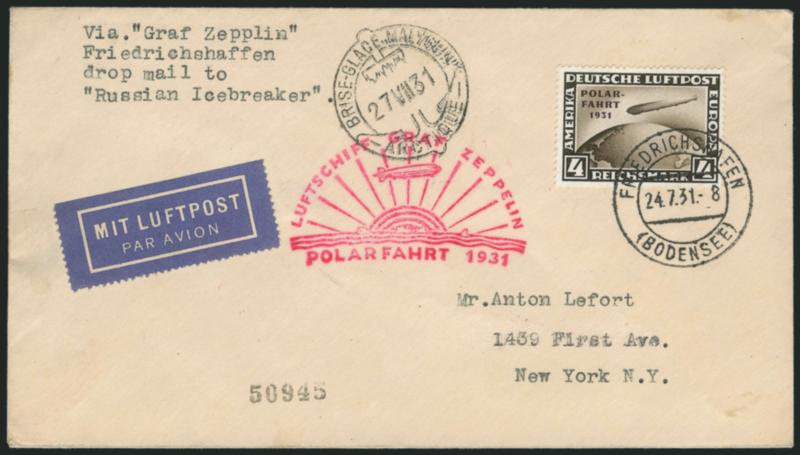 1843 c ImageGERMANY, 1931, 4m Black Brown, Polar Flight (C42). Tied by well-struck "Friedrichschafen 24.7.31" double-circle datestamp on cacheted cover to New York, neat Malyguin datestamp, purple "First Intourist Arctic Expedition Ice-Breaker Maligin 1931" backstamp, fresh and Very Fine (Image)