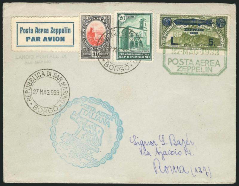 1844 c Image1933, May 29-30 -- Italy Flight from San Marino to Rome (AAMC Z-213var). Cover used from San Marino with 20c, 30c and 5l Zeppelin stamp, first two tied by "Republica di San Marino Borgo 27 Mag. 1933" datestamp, second strike at left, Zeppelin stamp tied by blue-green octagonal Zeppelin cancel, to Rome, Italy, blue cachet, green Friedrichschafen and receiving backstamps, Very Fine, scarce used from Borgo, ex Gruys (Image)