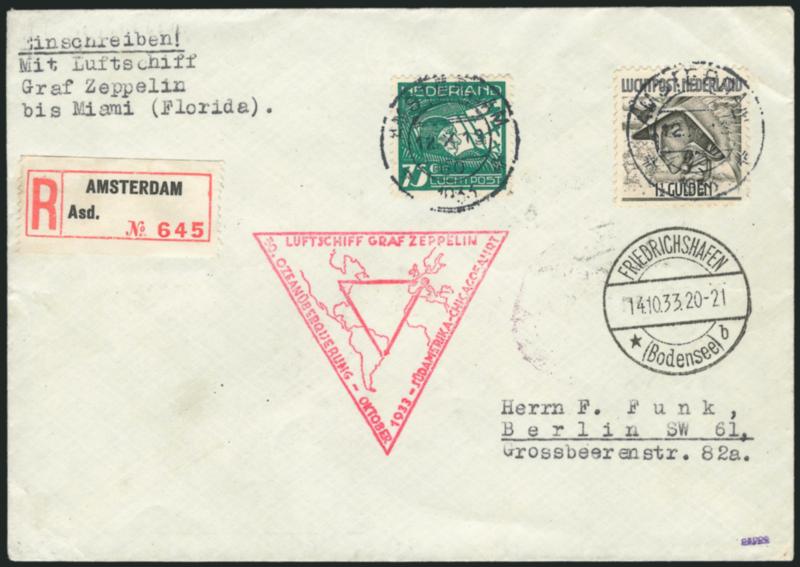 1845   Image1933, October 14-November 2 Century of Progress Flight, Netherlands to Miami (Sieger 238). Registered cover franked with two different Air Post Nos. C5-C6 tied by Amsterdam circular datestamps, red triangular flight cachet, backstamped with purple "Miami, Fla Registered Oct. 23 1933" receiver, New York and Berlin return transits, Very Fine, Netherlands frankings to Miami are quite scarce (Image)
