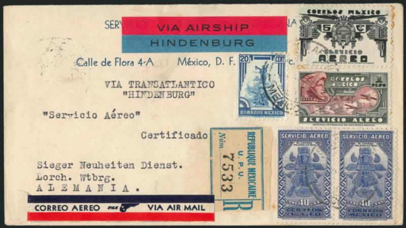 1846 c Image1936, May 25-June 3 -- Second South America Flight (AAMC Z-406, Sieger 411D). Cover bearing four different Mexico issues, tied by light strikes of May 18 circular datestamps on registered cover to Germany, neat purple "Correspondencias Registradas, Mexico D.F., May 18, 1936" oval backstamps, also with New York and Frankfurt backstamps, few toned perfs, otherwise Very Fine, this was the first official Zeppelin transport of Mexican mail and only registered letters received arrival markings (Image)
