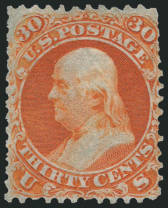 30c Red Orange, First Color (61). Unused (no gum), radiant color, reperfed at top and left, small semi-circular tear at left of vignette circleFINE APPEARANCE. A RARE EXAMPLE OF THE 30-CENT