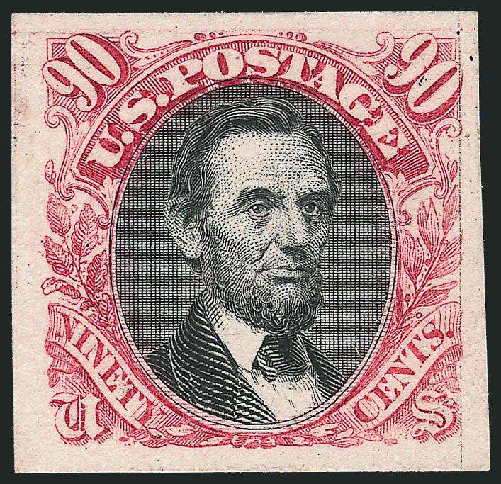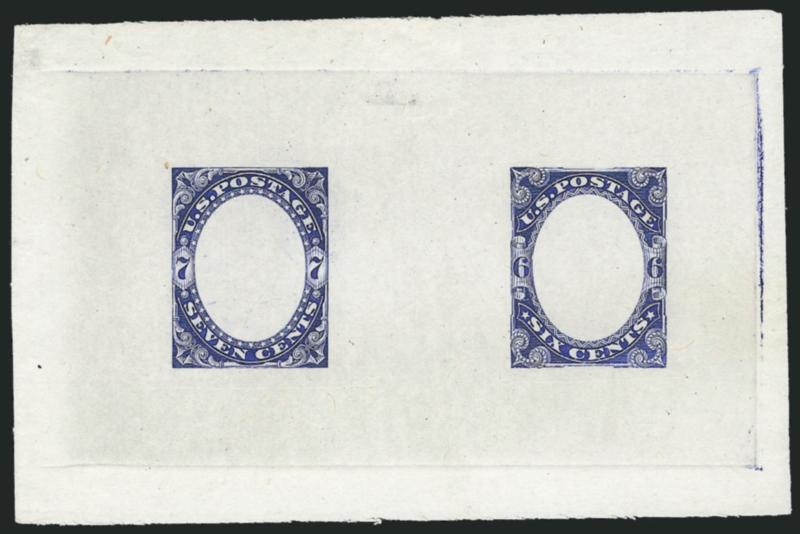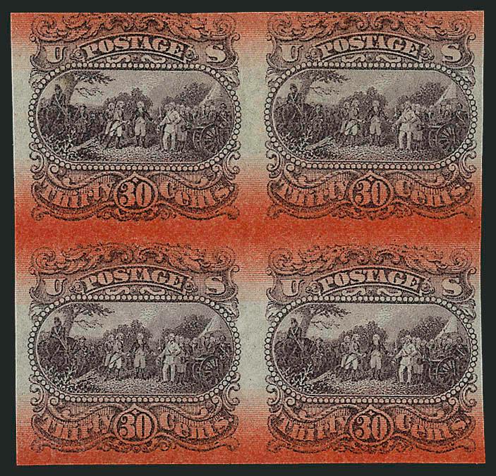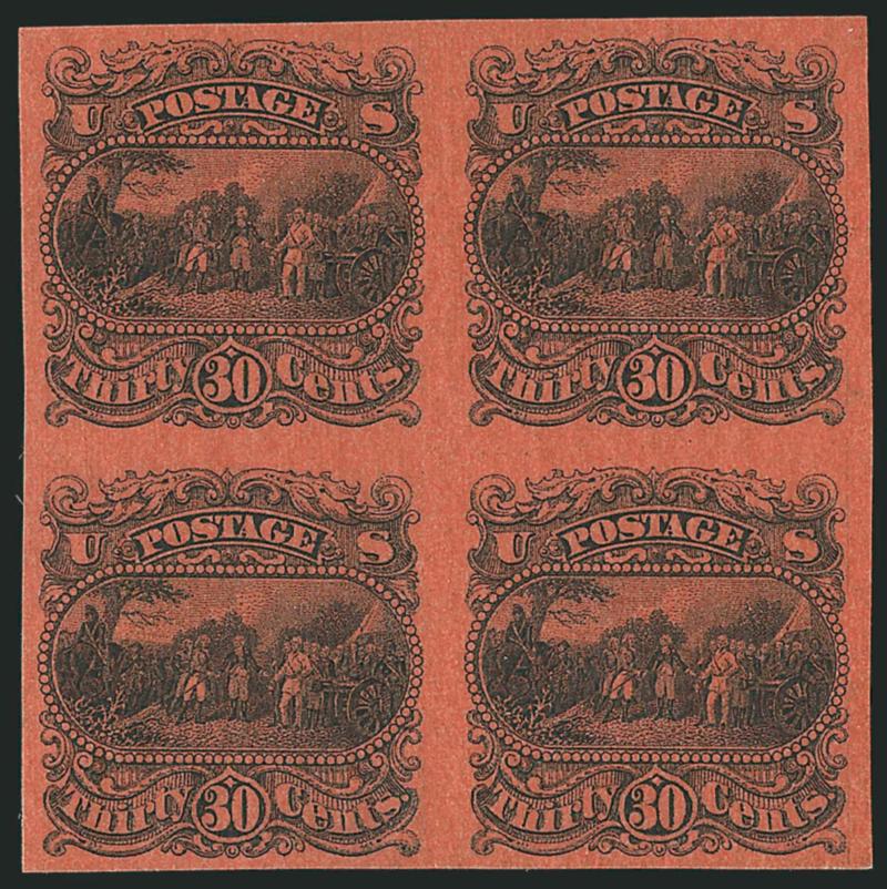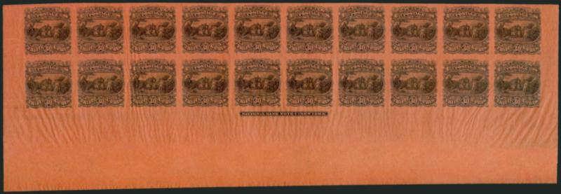 EXTREMELY FINE AND RARE BLOCK OF THE BOTTOM TWO ROWS OF THE PLATE OF THE 30-CENT BURGOYNE PLATE ESSAY. PROBABLY UNIQUE.