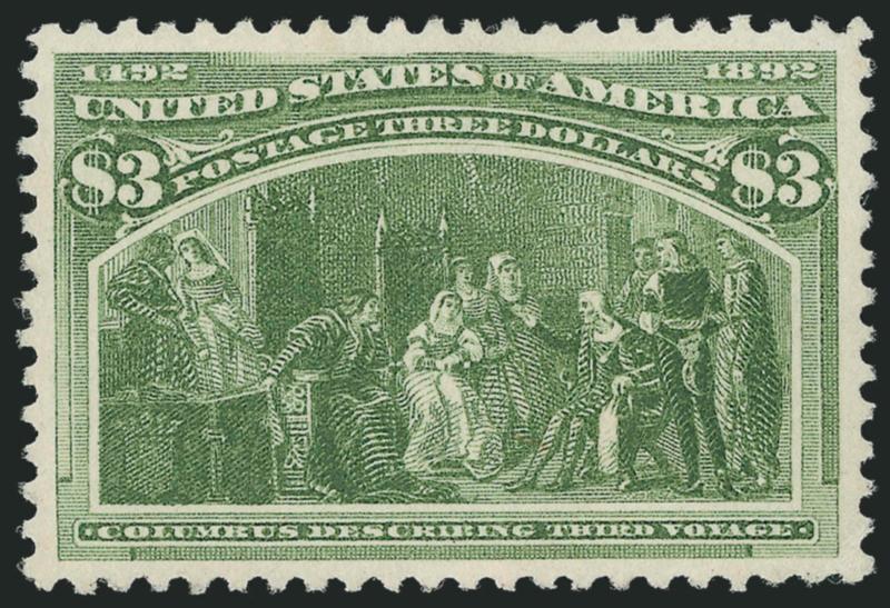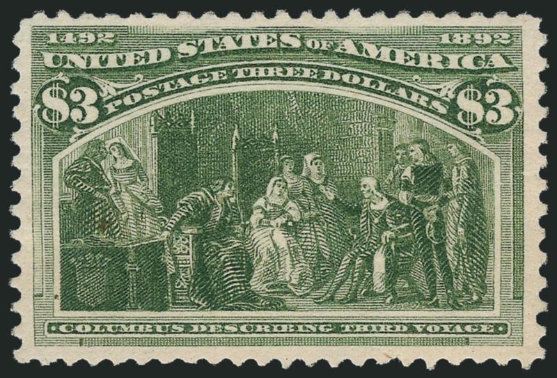 601 ng Image$3.00 Olive Green, Columbian (243a). Unused (no gum), deep rich color, remarkably well-centered with nicely balanced margins on bright white paper, Extremely Fine, a pretty stamp, with 2004 P.F. certificate (Image)