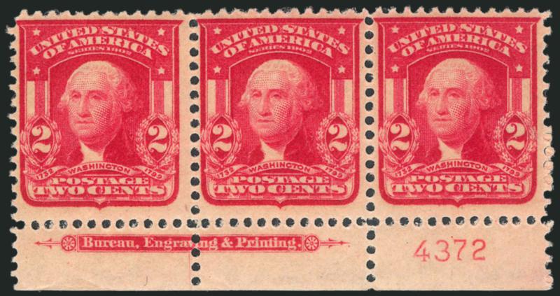 686 nh Image2c Carmine, Ty. II (319i). Mint N.H. bottom imprint and plate no. 4372 strip of three, gorgeous color, fresh and Very Fine, Scott Retail as singles (Image)