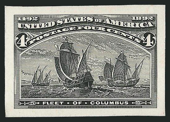 344 TC Image4c Columbian, Black Trial Color Die Proof on India (232TC2). Cut down to just above stamp size but still showing large margins, affixed to card backing, deep shade, Very Fine, Scott Retail as full size (Image)