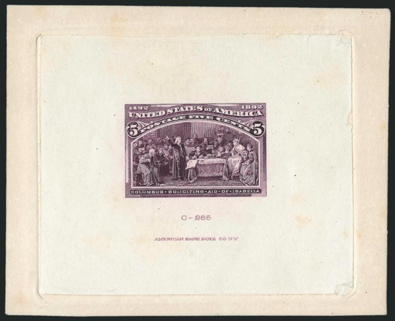 346 TC Image5c Columbian, Dark Violet Large Die Trial Color Proof on India (234TC1). Die sunk on 72 x 91mm card, imprint at bottom, deep rich color, couple small edge nicks at corners of die sinkage area, otherwise Very Fine (Image)