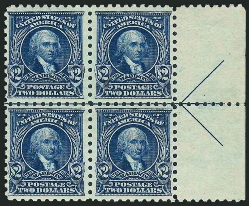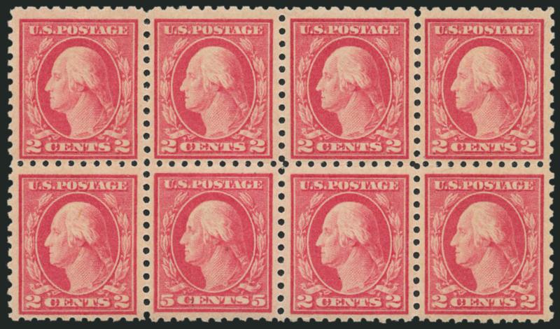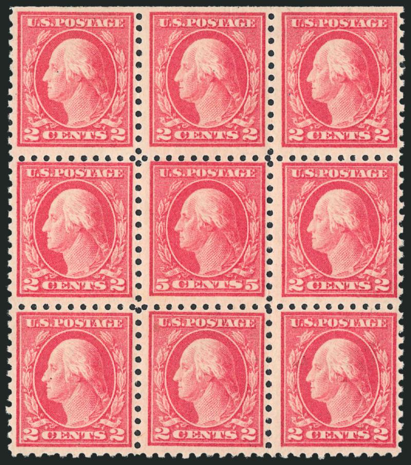 750 nh Image5c Carmine, Error (467). Pos. 6 in horizontal block of eight, error Mint N.H., couple others lightly hinged, choice margins, tiny natural inclusion in error stamp, otherwise Very Fine (Image)