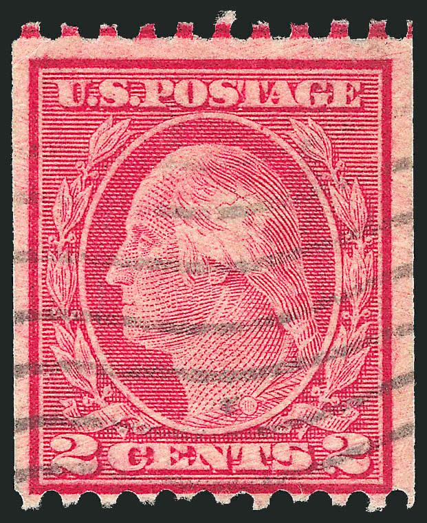 761   Image2c Carmine, Ty. II, Coil, Cracked Plate (487 var). Prominent forked lightning crack in Washington's hair, rich color, neat wavy-line machine cancel, Fine and a very unusual variety, this stamp is the basis for the Scott listing, where it is unpriced, accompanied by a Mekeel's article from 1965 relating to its discovery and its Scott listing (Image)