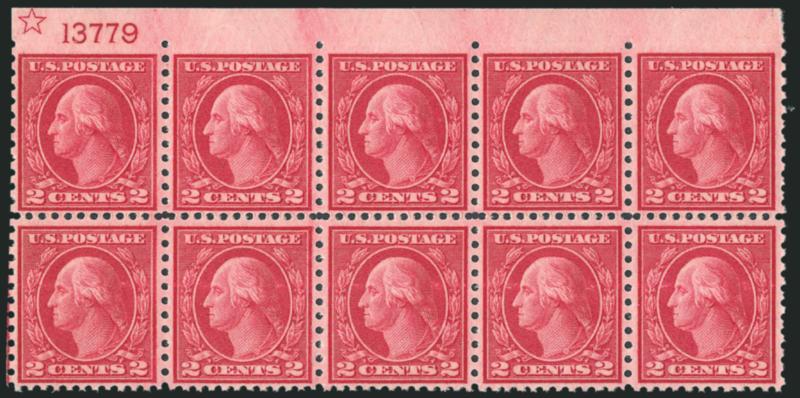 787 nhbl Image2c Carmine Rose, Ty. III, Rotary Perf 11 x 10 (540). Mint N.H. top plate no. 13779 and star block of ten, imperforate between top row and selvage, unusually choice centering for this issue, Very Fine and choice, Scott Retail as plate block of four and singles with no premium for the lack of perforations at top. (Image)