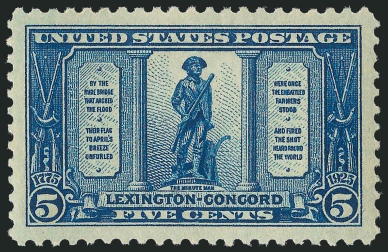 802 nh Image5c Lexington-Concord (619). Mint N.H., perfectly centered with unusually wide and balanced margins, intense shade and impression, Extremely Fine Gem, with 2011 P.S.E. certificate (Gem 100, unpriced in SMQ above the grade of 98, SMQ $320.00 as 98), this is the highest grade awarded to date and the only example to achieve this grade (Image)