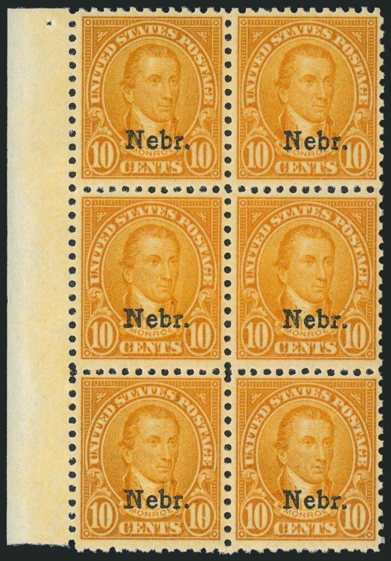 811 nhbl Image10c Nebr. Ovpt. (679). Mint N.H. vertical block of six with left selvage, rich color, Very Fine block, with six duplicated 2002 P.S.E. certificates (not photocopies) (Image)