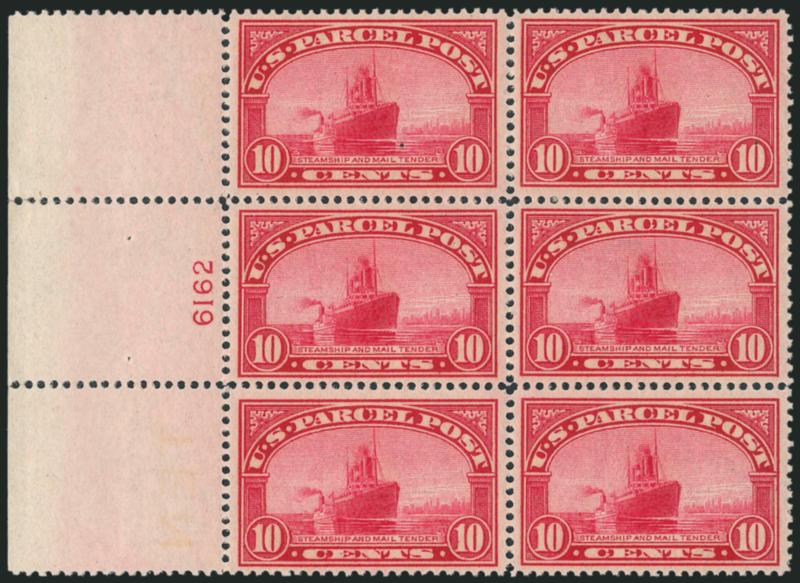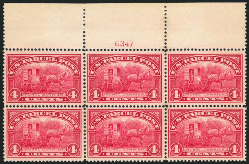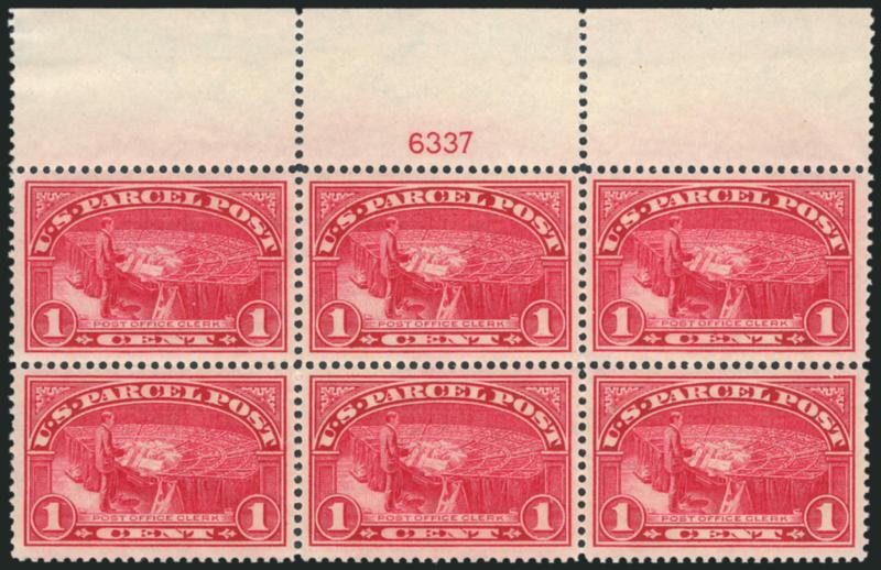 906 nhbl Image1c Parcel Post (Q1). Mint N.H. top plate no. 6337 block of six, wide margins and choice centering throughout, bright color, fresh and Extremely Fine, difficult to find in this premium condition (Image)