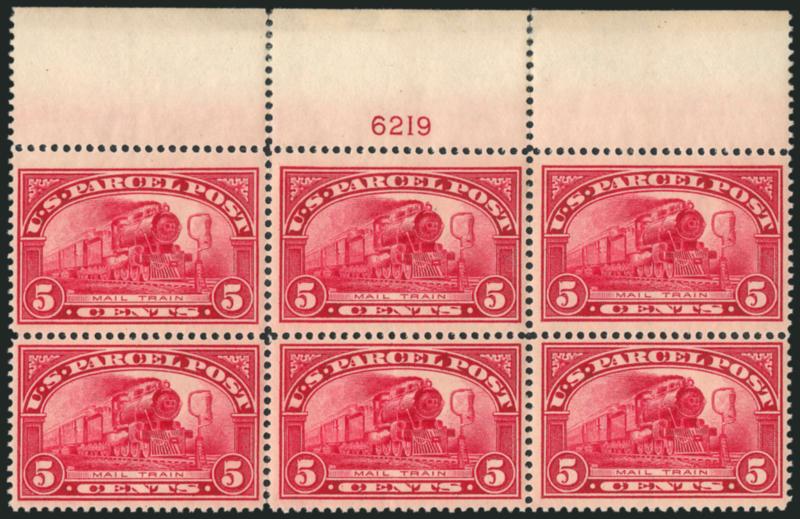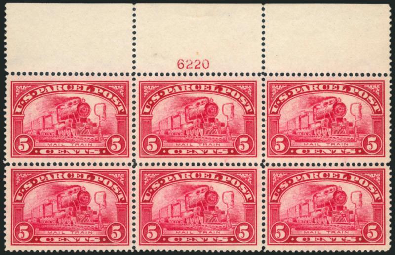 909 ogbl Image5c Parcel Post (Q5). Top plate no. 6220 block of six, appears Mint N.H. but some perf separations have been reinforced by brushing, rich color on crisp paper, choice centering, Very Fine, Scott Retail as hinged (Image)