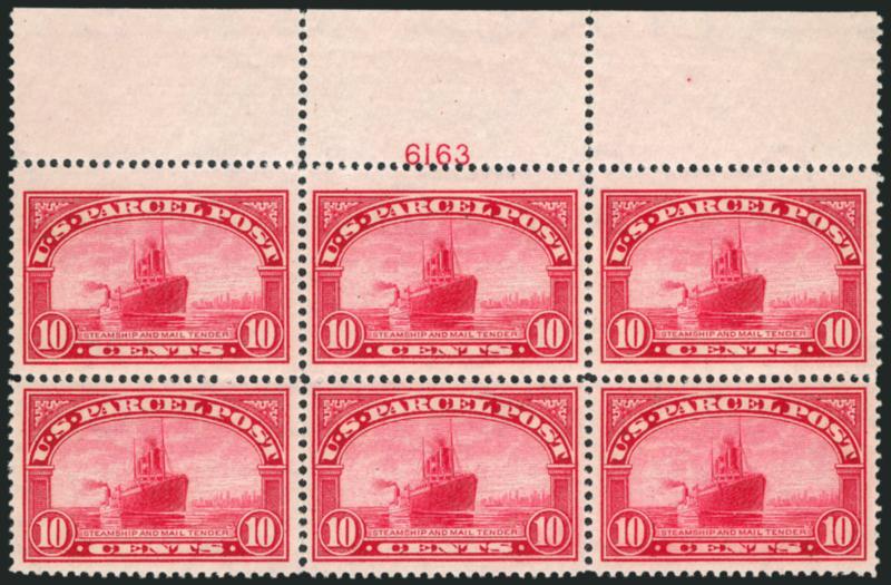 912 nhbl Image10c Parcel Post (Q6). Top plate no. 6163 block of six, not hinged but some perf separations in selvage and between pos. 4 and 5 reinforced from front, rich color, uncommonly wide margins with top row stamps Jumbos, Very Fine and choice, attractive plate block, Scott Retail as hinged (Image)