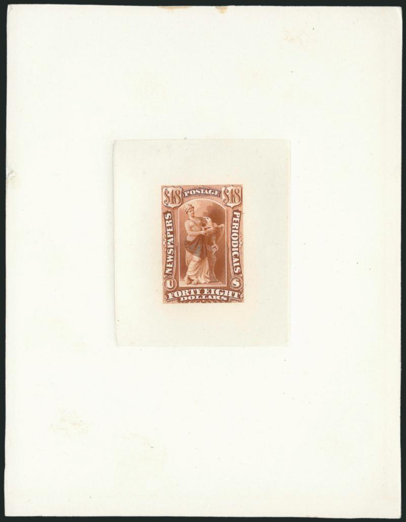 366 P Image10c-$48.00 1875 Newspapers, Large Die Proofs on India (PR15P1-PR31P1). Die sunk on approximately 118 x 153mm cards with full die sinkage, rich colors, few with small edge flaws or a light soiling spot here and there, overall Very Fine (Image)