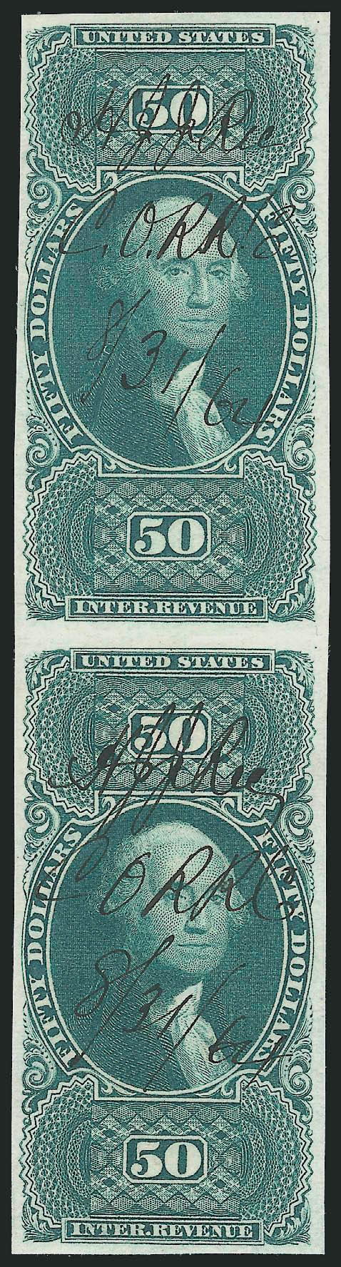962A   First Issue Revenues on Documents. Large box with many hundreds of documents, variety of stamps mostly to the 50c value but also a few $1.00-$5.00, incl. some imperforate and part perforate, nice range of documents, from the more mundane checks, payrolls, insurance certificates and deeds, to a large number of railroad related items incl. bonds and stock certificates, many with intricate designs, one with "The Crossing" National Bank Note Co. engraving by James Smillie (used for the 1869 3c Issue), a few steamboats, we also noted a mining document, a Miami Turnpike document and a wedding certificate, mixed condition as usual for this type of material but overall Fine-Very Fine, interesting group, ex Cunliffe
