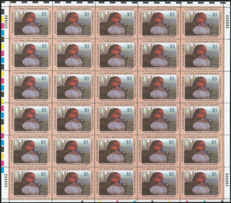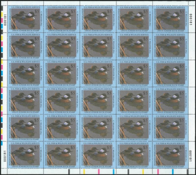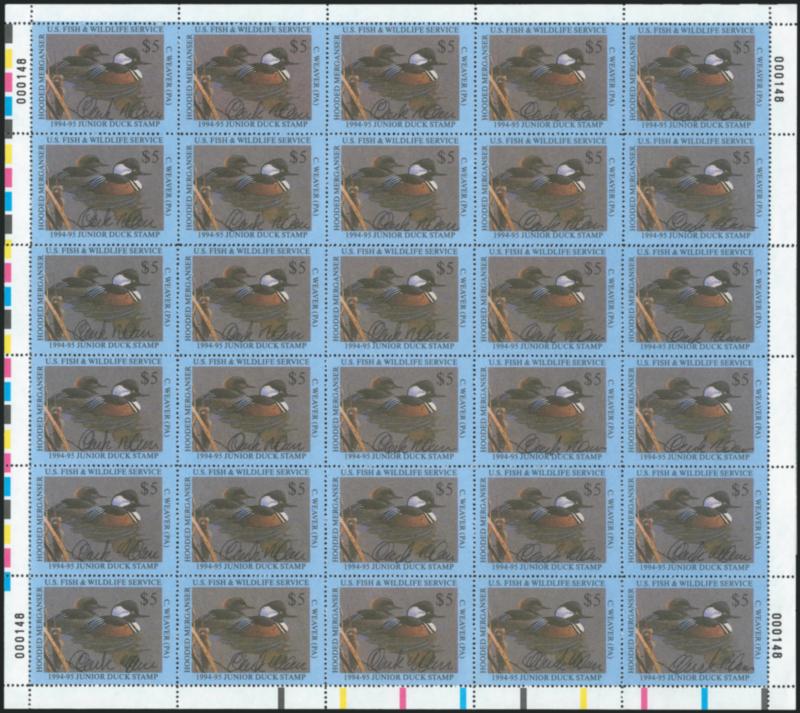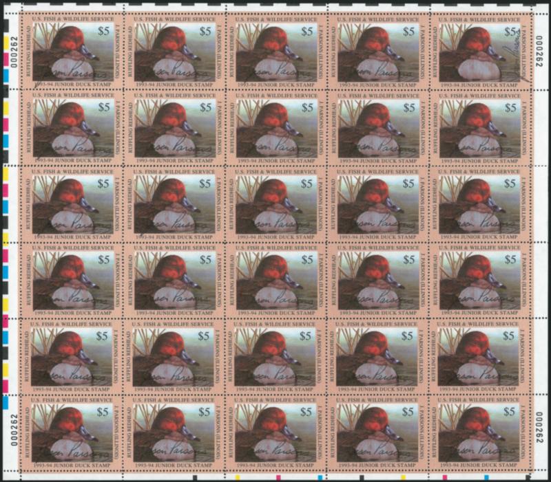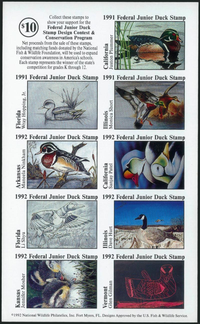 EXTREMELY FINE. A RARE COMPLETE SHEET OF THE 2000-2001 JUNIOR DUCK STAMP. VERY FEW ARE KNOWN.