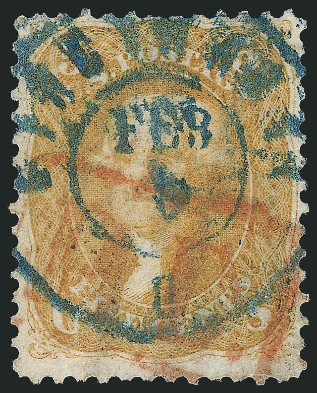 992   3c Ultramarine, Cancellation Study (114). More than 190 stamps and approx. 15 covers, wide range of cancels incl. grids, targets, cross-roads, stars, leafs, circular datestamps, red and blue, pairs and strips of three, also some varieties incl. four in the rich Dark Ultramarine shade, plate smears, one of the covers a very attractive shield embossed envelope with a patriotic enclosure -- an invitation to a banquet for the departure of the minister to Brazil, stamps in mixed condition, range from faulty to Very Fine appearance, Scott Retail more than $3,700.00