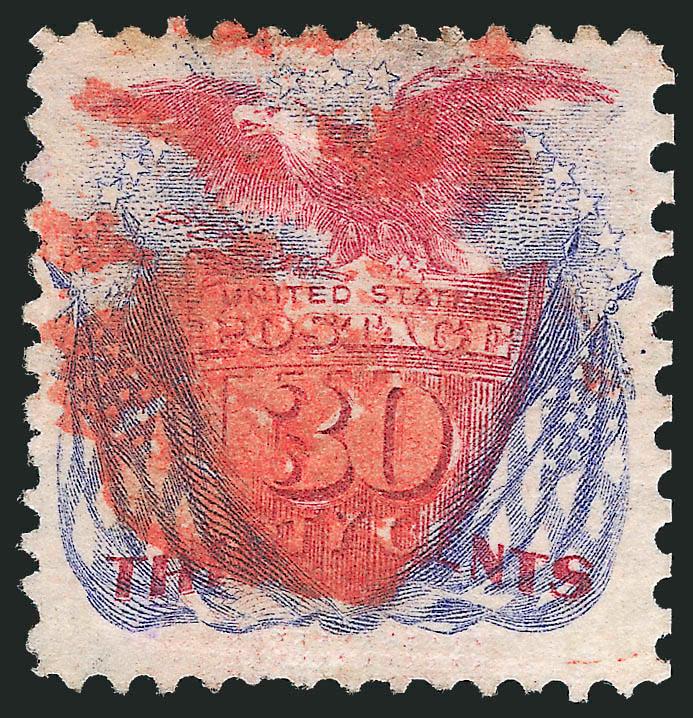 995   1869 Issue Used Balance (112-122). Large balance on stock pages, more than 90 stamps, largely collected as a cancellation study with an emphasis on colored cancels, incl. Nos. 112 -- six, 113 -- 15 singles and block of four, one with captured imprint, one with double perfs, 114 -- 22 incl. blue cancels, 115 -- 15 incl. blue and red cancels, 116 -- 11 incl. "Hiogo" Japan cancel, two with Baltimore foreign mail red dot cancels, also red and blue targets, 117 -- 18 incl. red and blue cancels, 118 -- three, 119 -- eight incl. two red, two blue and one magenta cancel, 120 -- one with red cancel, 121 -- three, one red cancel, one blue circular datestamp, 122 -- two, also two 2c covers (one a mixed franking with 1c), generally mixed condition, but appear Fine with attractive strikes, five certificates accompany, Scott Retail with premiums for the colored cancels approx. $27,000.00