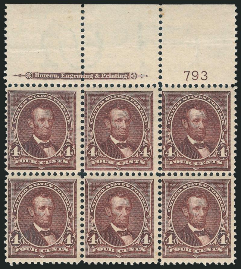 999 og ImageBureau Issues, 1894-98. Three better items, incl. No. 264a pair, 273 right imprint and plate no. 64 strip of three and 280a top imprint and plate no. 793 block of six, all original gum, 10c Mint N.H., other two lightly hinged, Fine-Very Fine (Image)