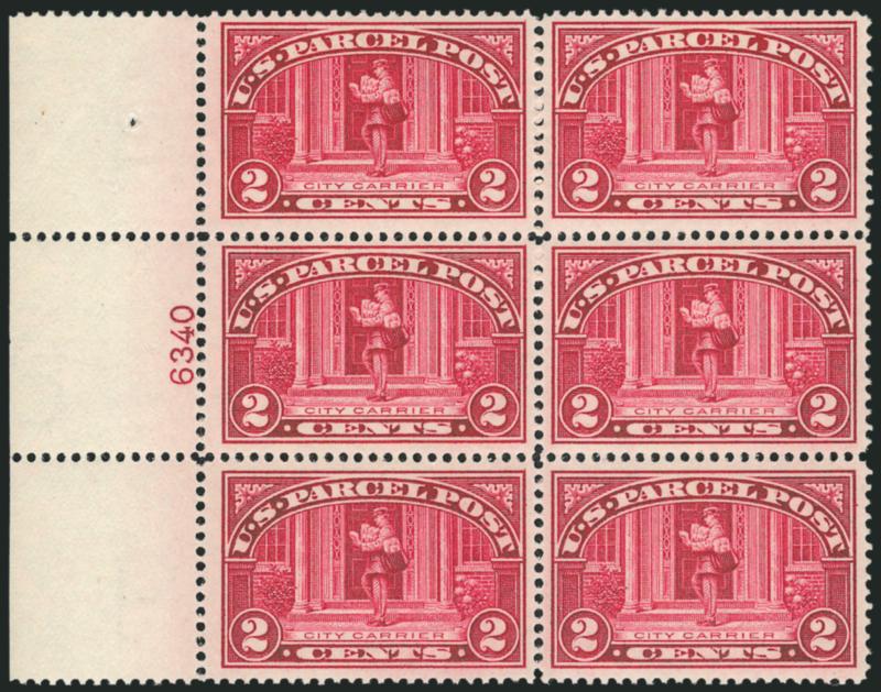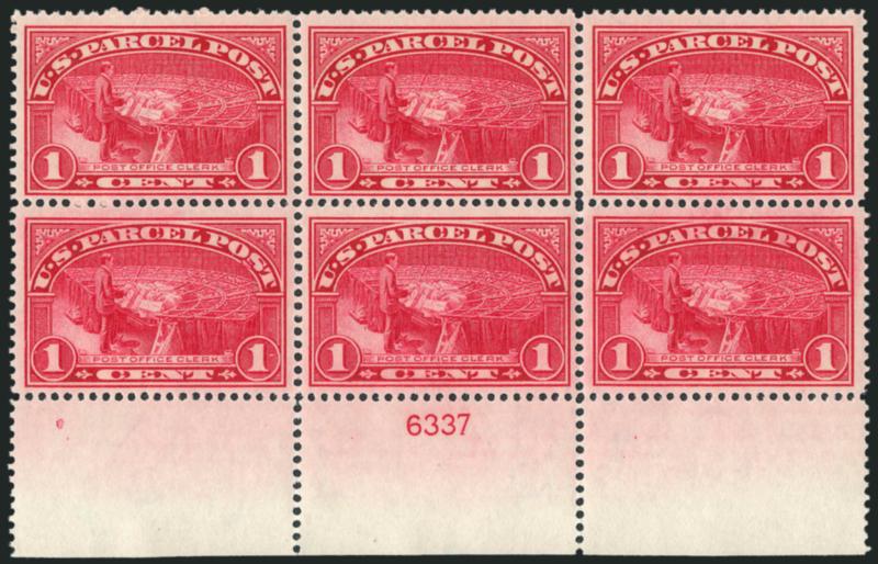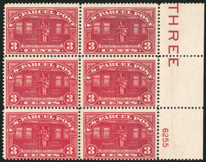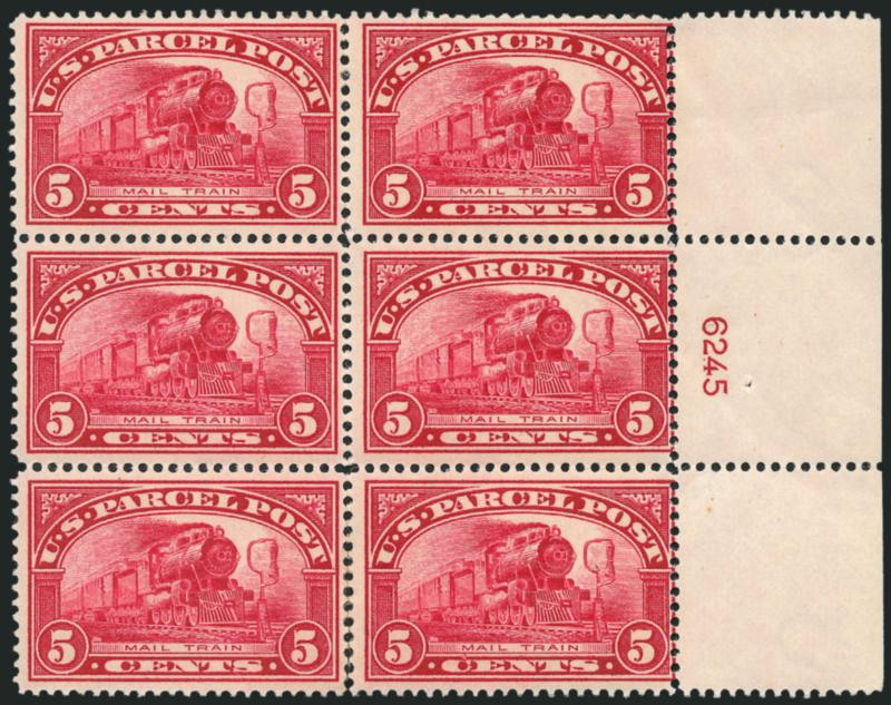 1093 ogbl Image1c-2c Parcel Post (Q1-Q2). Three plate no. blocks of six of No. Q1, incl. two from right and one from bottom, two Mint N.H., one barest trace of hinging, brilliant colors, fresh and Fine-Very Fine, Mint N.H. left plate no. 6340 block of six of No. Q2, top left stamp light natural vertical crease, slightly oxidized, Fine-Very Fine, with 2007 P.F. certificate (Image)