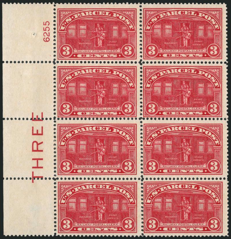 1094 ogbl Image2c-4c Parcel Post (Q2-Q4). 2c Mint N.H. right plate no. 6340 block of six, 3c Mint N.H. left plate no. 6255 and imprint block of eight, 4c is top plate no. 6169 block of six, last with h.r. and gum skips, bright colors, Fine-Very Fine, attractive group of plate blocks (Image)