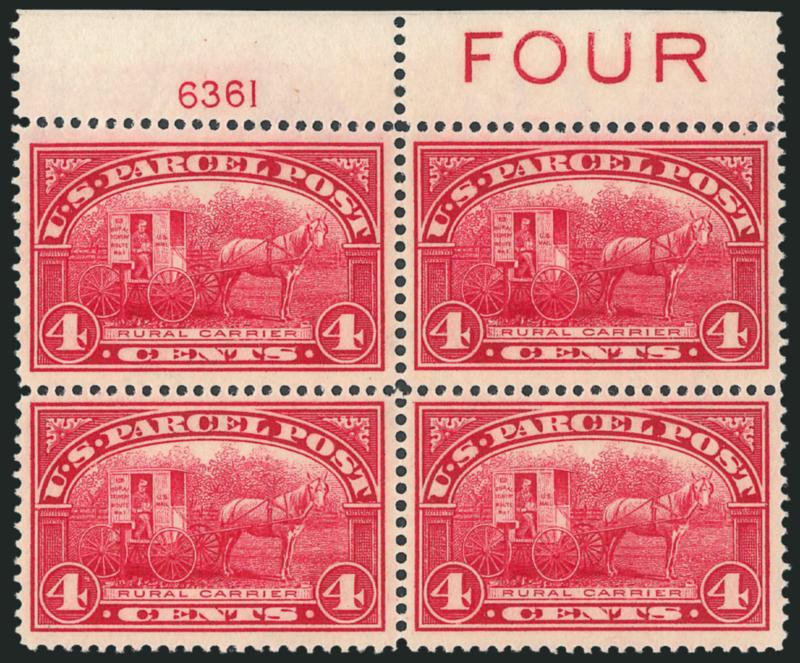 1095 ogbl Image3c-4c Parcel Post (Q3-Q4). Plate no., "Three" and "Four" imprint blocks of four, bottom and top respectively, bright colors and nice centering, Very Fine (Image)