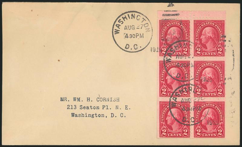 1120   ImageBooklet Panes Balance (301c, 319g, 583a, C10a). First No. 301c, Position E, Mint N.H., few perf separations, otherwise Fine, second No. 301c pair and single, on cover from Ballston Spa. N.Y. to London, some edge wear and light soiling, otherwise Very Fine, scarce international use, third No. 319g, Position D, with Durland listed scarce plate no. 2955, tropicalized original gum, brilliant color and exceptionally well-centered, Extremely Fine, fourth No. 583a on Washington D.C. First Day cover, Fine and scarce, finally four covers franked with No. C10a, two with pane singles on 5c Beacon covers for the 2nd "Anniuersary" (sic) of Lindbergh's 1929 Good Will Visit, two pane singles on cover tied by blue green boxed Frogs, fancy registered use from Ed Ky., and a pane of three used on 1931 Clipper Flight from Miami to Colombia, Fine, total Scott Retail more than $2,800.00 (Image)